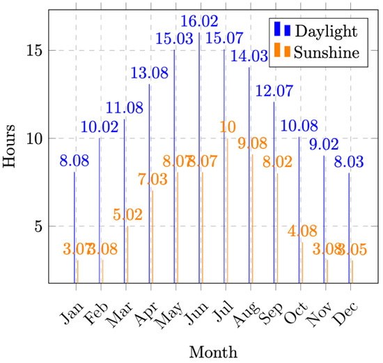 Figure 1 gives the average daylight hours (blue bars), which is the time from sunrise to sunset each month. This shows how long the sun is above the horizon, regardless of the weather. Also given are the sunshine hours (orange bars), which are the actual hours of sunlight without obstruction. These hours are typically less than daylight hours due to clouds or rain. Figure 1 indicates that maximum daylight occurs in June with 16.02 h, and the minimum occurs in December with 8.03 h.