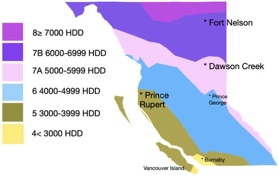 Heating Degree Days (HDD) are used to estimate the energy needed to heat buildings based on outdoor temperatures. HDD measures how much and for how long the outdoor temperature is below 18 ° C, indicating when heating is needed. The unit is ° C · days. Architects and engineers use HDD to design heating systems and improve resource efficiency. Utilities use HDD to predict heating fuel demand and manage supply. By understanding HDD trends, energy use can be optimized, reducing emissions and enhancing sustainability. Figure 2 shows the climate zones in BC based on HDD, which are crucial for climatic analysis. HDD provides vital data for designing efficient heating systems in the proposed SGTs.