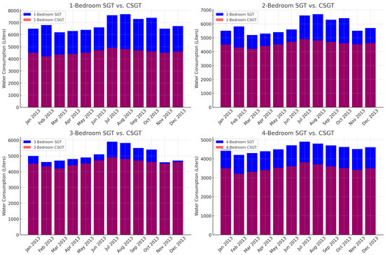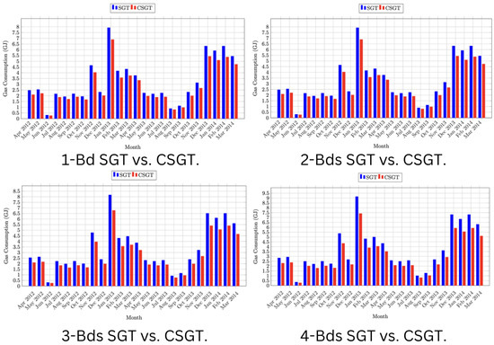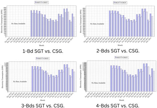 Connecting residential buildings reduces resource consumption and costs [42]. This is crucial in SGTs to lower load consumption, lower costs, and improve efficiency. Connected buildings enable more efficient energy management [42] as they form a single unit similar to Micro-Grids (MGs) [43,44]. CSGTs in grid-connected mode are considered to reduce electricity consumption, improve demand response, and enhance overall performance. The building consists of four connected townhouses (one-, two-, three-, and four-bedroom CSGTs). Grid connection adds to the system complexity. In this work, the challenges and solutions related to load consumption in SGTs connected to the grid are examined [42]. The advantages of connecting SGTs include reduced resource consumption, lower costs, improved efficiency, and load optimization. These benefits demonstrate how connected systems contribute to sustainable and efficient SGBs.