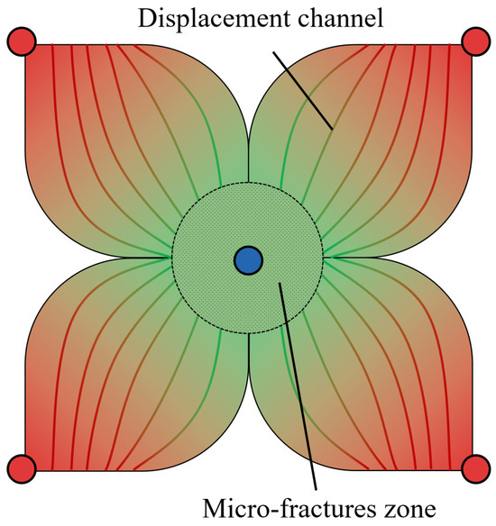 The mechanism of enhanced recovery and efficiency through fracturing-flooding processes mainly includes three aspects [20]: enhancing water injection capability, establishing a displacement mechanism, and expanding the swept area. Enhancing water injection capability involves creating a high-pressure zone near the injection well, which activates existing closed fractures within the reservoir or generates micro-fractures [21]. This fracture extension quickly supplements the reservoir’s energy and increases reservoir pressure, significantly improving water injection capability, and increasing both the production pressure differential and the fluid and oil output of oil wells. Maintaining low permeability reservoirs at relatively high pressure levels can reduce permeability loss caused by pressure sensitivity. By optimizing the timing and cycles of fracturing-flooding, reservoir pressure can be restored earlier, allowing high permeability to be sustained for longer periods, which in turn establishes stable and effective displacement. Current numerical simulations of fracturing-flooding indicate that by implementing fracturing-flooding, the rate of pressure drop in fractured zones is significantly slowed, the pressure front advances, and the pressure gradient in the reservoir matrix is greatly increased. This markedly improves oil displacement efficiency, significantly enhances water phase flow capability after overcoming the low-velocity non-Darcy effect, and substantially boosts oil well productivity, thereby increasing recovery rates. As shown in Figure 1, micro-fracture zones are generated in the central zone by fracturing-flooding, thereby advancing the fracturing-flooding front and establishing more displacement channels between wells.