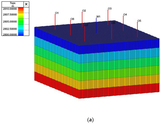 To explore the dynamic behavior of fracturing-flooding under different reservoir physical property conditions, numerical simulation is used to calculate production under various model property parameter settings and development schemes. The target block injection–production well pattern employs the nine-point method. The middle W1 is an injection well, and the surrounding O1 to O8 are 8 production wells. The average distance between the injection well and the production well is 360 m, with an initial permeability of 6 mD, porosity of 0.16, formation depth of 2800 m, and original formation pressure of 33.6 MPa. As shown in Figure 2a, based on the conditions of the target well group, a reservoir simulator is used to establish a six-layer dual-porous and dual-permeable media model with grid dimensions of 136 × 106 × 12 and individual grid size of 10 m × 10 m × 2 m. All grid sizes in the same model are consistent, with zones 1–6 in the Z-direction as the matrix zone, and zones 7–12 as the fracture zone. The maximum rock stress sensitivity direction is the X-direction. The definition rules of the oil–water relative permeability curve are shown in Figure 2b. The water viscosity is 0.7 cP, the oil viscosity under the original formation pressure is 2.86 cP, and the oil–water densities are 863 kg/m3 and 1020.2 kg/m3, respectively.