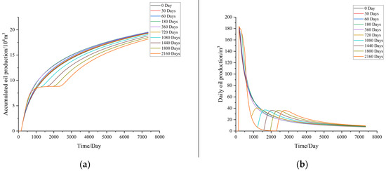 Research on the optimal timing for transitioning to conventional water injection in the target well group was conducted, setting the entire production cycle to 19.5 years. The oil wells begin production on the 31st day after the completion of fracturing-flooding. Ten production scenarios were simulated by setting the transition to conventional water injection at the end of the shutdown period on days 0, 30, 60, 180, 360, 720, 1080, 1400, 1800, and 2160. The development results are shown in Figure 3.