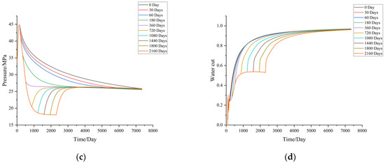 As shown in Figure 3a,b, the differences in daily oil production rates at different transition timings to conventional water injection mainly occur between the well opening production and the stable decline phase. The earlier the transition to conventional water injection, the faster the rate of decline from the peak daily oil production, causing the entry into the stable decline phase to occur earlier. Conversely, a later transition to conventional water injection can lead to a period of low production or even shutdown after the peak decline. As illustrated in Figure 3c, if the transition timing is too early, the reservoir pressure does not sufficiently diffuse, leading to poor displacement efficiency. If the transition timing is too late, the reservoir pressure cannot be supplemented in a timely manner after peaking, delaying the entry into the stable production phase and significantly impacting production. Figure 3d shows that the water cut trends differ minimally for scenarios transitioning earlier than 720 days, whereas a significant delayed inflection point appears in the water cut rise curve for transition timings later than 720 days, indicating that a late transition can severely affect the development performance.