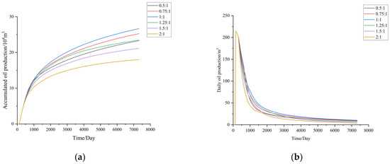 Figure 12 displays the accumulated oil production for different injection–production ratios under various physical property conditions. The simulation results for both sets of models show a similar trend: when the injection–production ratio increases from 0.5:1 to 1:1, the final accumulated oil production significantly improves. However, as the injection–production ratio further increases from 1:1 to 2:1, the accumulated oil production shows a declining trend. The greater the reservoir thickness and the higher the permeability, the more significantly the injection–production ratio affects the outcome.