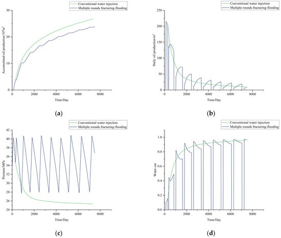 Figure 5 compares the development effects of the multi-cycle fracturing-flooding scheme and the conventional water injection scheme. From Figure 5a, it can be seen that the accumulated oil production of multi-cycle fracturing-flooding shows wave-like increases compared to the conventional water injection scheme. Figure 5b reveals that the daily oil production curve of multi-cycle fracturing-flooding is similar to that of conventional water injection, with peak production achieved upon well opening followed by a gradual decline. However, differences exist between cycles. The first cycle of fracturing-flooding ended with an initial daily oil production of 215.14 standard cubic meters, which quickly decreased to 202.41 standard cubic meters at the start of fracturing-flooding. During the second cycle, daily oil production first increased and then decreased, starting lower than the daily oil production under the conventional water injection scheme but equaling it at the peak of the second cycle, after which the rate of decline was slower, maintaining a period of high production. For the third and subsequent cycles, daily oil production initially increased, starting lower than the concurrent conventional water injection scheme but eventually exceeding it until the next fracturing-flooding began. Figure 5c compares the average reservoir pressure change curves between the two schemes. Unlike the monotonous decline of the pressure curve in the conventional water injection scheme, the multi-cycle fracturing-flooding scheme’s pressure curve fluctuated between the set upper limit of 40.0 MPa and the lower limit of 28.0 MPa. Figure 5d compares water cut change curves, showing that the first cycle of multi-cycle fracturing-flooding had a lower water cut with an increasing trend; the second cycle showed a decreasing then increasing water cut, while the third and subsequent cycles demonstrated a decreasing trend in water cut.