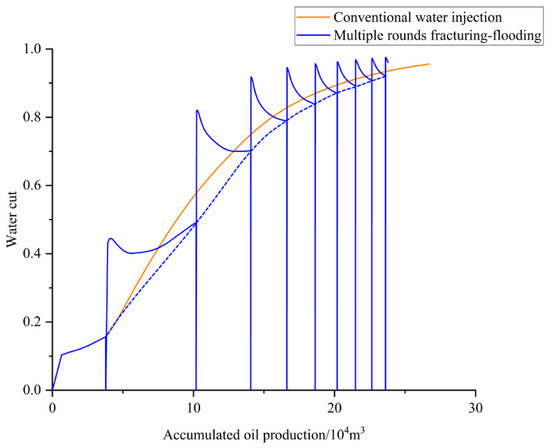 Considering the characteristics of large variations in water injection rate and high total water injected in multi-cycle fracturing-flooding, comparing accumulated oil production from the perspective of water cut can provide a more reasonable assessment of the development effects when transitioning to multi-cycle fracturing-flooding. Figure 6 illustrates the accumulated oil production corresponding to the same water cut for both the multi-cycle fracturing-flooding and conventional water injection schemes. The blue dashed line indicates the trend of accumulated oil production for the multi-cycle fracturing-flooding. Overall, the multi-cycle fracturing-flooding scheme results in greater accumulated oil production at the same water cut, compared to the conventional water injection scheme.