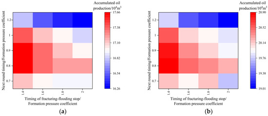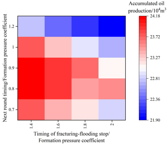 Figure 7 illustrates the final accumulated oil production corresponding to different multi-cycle fracturing-flooding production regimes with varying timings for the next round of fracturing-flooding and subsequent production phases. The horizontal axis represents the formation pressure coefficient corresponding to the timing for transitioning to the next production phase, i.e., the stopping point of fracturing-flooding. The vertical axis indicates the formation pressure coefficient corresponding to the start of the next round of fracturing-flooding. Each grid represents a production regime, where redder colors indicate higher accumulated production and bluer colors indicate lower accumulated production for that regime. It can be observed that the highest accumulated oil production for the target well group occurs when the next fracturing-flooding timing corresponds to a formation pressure coefficient of 0.9, and the next production phase timing corresponds to a coefficient of 1.4. Conversely, the lowest accumulated oil production occurs when the next fracturing-flooding timing corresponds to a coefficient of 1.2, and the next production phase timing corresponds to a coefficient of 2. Additionally, strategies with an earlier timing for the next production phase tend to perform better than those with later timing, and options with a smaller span between fracturing-flooding start and stop are generally more favorable than those with a larger span.