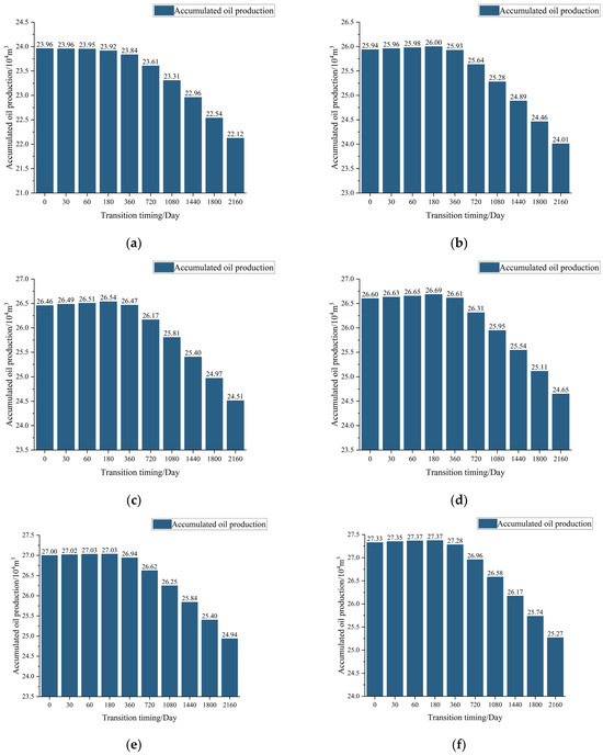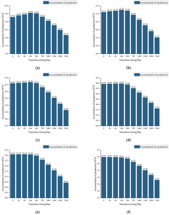 To investigate the optimal timing for transitioning to conventional water injection under different effective thicknesses of oil reservoirs, various effective thicknesses were set on the basis of the original model, specifically at 8 m, 10 m, 12 m, 14 m, 16 m, and 20 m. Using reservoir numerical simulation software, simulations were conducted to obtain the final accumulated oil production corresponding to different timings for switching to conventional water injection across these thicknesses, as illustrated in Figure 8.