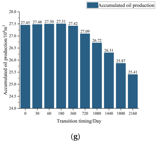 Figure 10a shows the final accumulated oil production for each conventional water injection timing when the model reservoir permeability is set to 1 mD. It can be seen that as the conventional water injection timing was delayed from day 0 to day 2160, accumulated oil production decreased from 239,610 tons on day 0 to 221,240 tons on day 2160. Figure 10b shows that when the reservoir permeability is set to 3 mD, accumulated oil production increases from 259,390 tons on day 0 to 260,010 tons on day 180, and then decreases to 240,110 tons on day 2160. Figure 10c shows that when permeability is set to 5 mD, accumulated oil production increases from 264,580 tons on day 0 to 265,380 tons on day 180, and then decreases to 245,130 tons on day 2160. Figure 10d shows that when permeability is set to 6 mD, accumulated oil production increases from 266,010 tons on day 0 to 266,850 tons on day 180, and then decreases to 246,500 tons on day 2160. Figure 10e shows that for a permeability of 10 mD, accumulated production increases from 269,990 tons on day 0 to 270,340 tons on day 60, then decreases to 249,370 tons on day 2160. Figure 10f shows that for a permeability of 20 mD, accumulated production increases from 273,290 tons on day 0 to 273,730 tons on day 180, then decreases to 252,710 tons on day 2160. Figure 10g shows that for a permeability of 30 mD, accumulated production increases from 274,540 tons on day 0 to 275,050 tons on day 180, then decreases to 254,050 tons on day 2160.