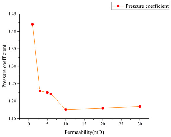 Figure 11 illustrates the formation pressure coefficients corresponding to the optimal timing for transitioning to conventional water injection under different effective thicknesses. When the reservoir permeability is 1 mD, the formation pressure coefficient at the optimal timing is 1.42, while for other permeabilities, the formation pressure coefficients at optimal timings are between 1.18 and 1.23. As the effective thickness increases, the optimal transition timing generally first delays and then advances.
