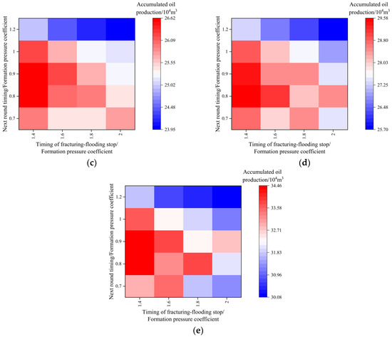 Figure 13 compares the final accumulated oil production under different multi-cycle fracturing-flooding strategies for models with varying effective oil layer thickness. Figure 13a shows the final accumulated oil production for different multi-cycle fracturing-flooding strategies when the effective oil layer thickness is 8 m. The highest accumulated oil production occurs when the next round timing corresponds to a formation pressure coefficient of 0.8, and the next production timing corresponds to a formation pressure coefficient of 1.4. The lowest occurs when the fracturing-flooding timing corresponds to a coefficient of 1.2 and the production timing to a coefficient of 2. Figure 13b presents the results for a thickness of 10 m, with the highest production at a fracturing-flooding timing coefficient of 0.8 and a production timing coefficient of 1.4, and the lowest at 1.2 and 2, respectively. Similarly, Figure 13c shows the results for a 14 m thickness, with the highest production at timing coefficients of 0.9 and 1.4, and the lowest at 1.2 and 2. Figure 13d illustrates the case for a 16 m thickness, showing the highest production at timing coefficients of 0.8 and 1.4, and the lowest at 1.2 and 2. Finally, Figure 13e depicts the 20 m thickness scenario, with the highest production at timing coefficients of 0.9 and 1.4, and the lowest at 1.2 and 2.