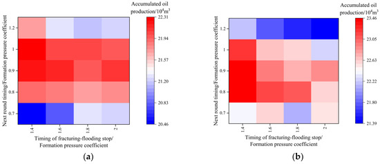 From the above results, it can be summarized that for reservoirs with different permeabilities, the optimal regime for transitioning to multi-cycle fracturing-flooding is approximately the same. The best development effect is generally achieved when the timing for the next round corresponds to a formation pressure coefficient of around 0.9, and the timing for the next production corresponds to a formation pressure coefficient of 1.4. For low-permeability reservoirs with particularly low permeability, the timing for the next round should be slightly advanced. For low-permeability reservoirs with relatively higher permeability, the timing for the next round should be slightly delayed. Similar to the aforementioned model, in general, a scheme with an earlier timing for the next production is better than one with a later timing. Additionally, a scheme with a smaller span between the start and stop of the fracturing-flooding is generally better than one with a larger span.