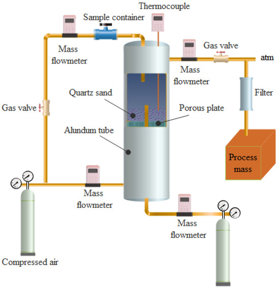 The coupled combustion experiments of bio-syngas and bituminous coal were performed in MFBRA, which mainly includes components such as corundum reactor, perforated plates, air compressors, bio-syngas cylinders, pulse injectors, filters, online mass spectrometer (GSD 320, Pfeiffer Vacuum, Asslar, Germany, the error of 30% (on the order of ppm)), valves, pressure gauges, mass flow meters, and temperature controllers, as shown in Figure 1. The corundum reactor is heated by a 30 kW microwave radiation heating furnace, and the maximum temperature can reach 1400 °C. The outside and inner diameter of the corundum reactor are 0.026 m and 0.019 m, the total length is 0.52 m, and a porous plate is placed in the interior of the corundum reactor. The quartz sand bed material with a mean diameter of 1.25 × 10−4 m is placed in the porous plate, and the loading height is 0.030 m. Five branches were designed in the corundum reactor, the first one for solid particle injection by compressed air, the second for temperature sensors’ installation, the third for the inflow of compressed air, the fourth for the inflow of bio-syngas, and the last for process mass spectrometry bonding. The flow rates of the compressed air and bio-syngas were controlled using two-mass flowmeter. Compressed air and quartz sand were used as the carrier gas and the fluidization medium, respectively. The flow rate of the carrier gas, temperature of the furnace, and actions of pulse sample injection were all controlled by a computer.
