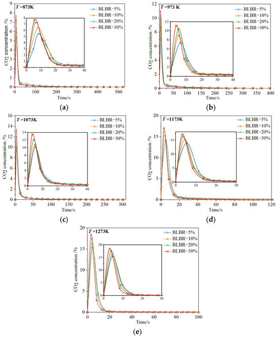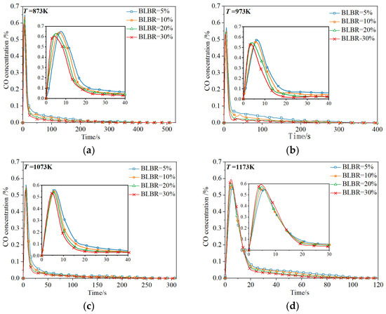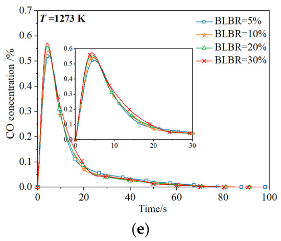 As can be seen from Figure 2 and Figure 3, it was demonstrated that the influence of BLBR on the concentrations CO and CO2 gas production in the coupled combustion process was inconsistent at different temperatures, and the time to completion of the reaction was shortened with the increase in BLBR from 5% to 30%. At 873–1073 K, as the BLBR increases, the concentration of CO gas production decreases, the concentration of CO2 increases, and the release curves of CO and CO2 gas production shift to the left. The reasons why are mainly as follows: On the one hand, the greater the BLBR, the higher the content of combustible components, thus accelerating the release and combustion of volatile fraction, and the ignition and combustion of coal char. Moreover, the hydrogen contained in bio-syngas and bituminous coal greatly accelerates the reaction rate of CO converting to CO2. On the other hand, within the range of 873–1073 K, the gasification reaction of coal char has not occurred yet. At 1173–1273 K, the concentrations of CO and CO2 both increase with the increase in the BLBR, mainly due to the increase in the BLBR, which promotes the gasification reaction of coal char and thereby increases the concentrations of CO.