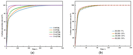 According to Equation (3), the relationship between carbon conversion and time is illustrated in Figure 4a,b. Figure 4a shows that carbon conversion of bituminous coal increased slightly, and the burnout time decreased with the increase in BLBR. The major carbon conversion process (90%) can be completed within 18 s at . Based on Figure 4b, as the temperature was increased from 873 K to 1273 K, carbon conversion of bituminous coal increased quickly in the initial stage, and the major reaction process and the burnout time were shortened. The major carbon conversion process (90%) can be completed within 15 s at , which is much shorter compared with the reaction equilibrium time.