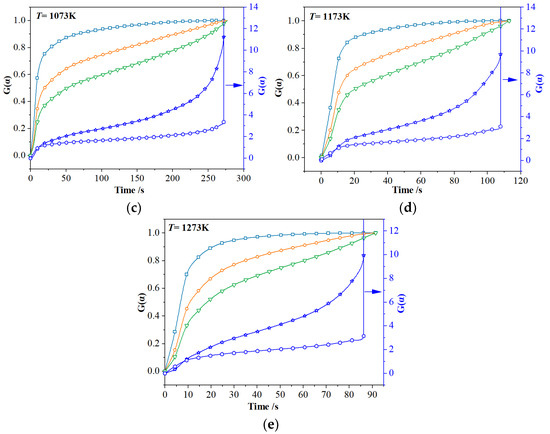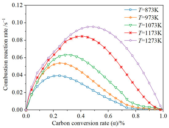 According to Equation (4), the relationship between the rate of bituminous coal combustion reaction and carbon conversion, , is illustrated in Figure 5 at within the temperature range of 873~1273 K. Figure 5 shows that the rate of bituminous coal combustion reaction in the temperature range of 873~1273 K presents a trend of first increasing and then decreasing with the increase in the carbon conversion rate. The position where the highest combustion reaction rate appears shifts to the right, and the main combustion reaction process is between and . This is mainly because bituminous coal combustion belongs to the diffusion combustion at high temperatures.