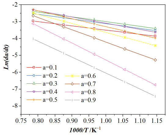 According to Equation (11), the relationship between and can be fitted as a straight line under iso-conversion rate conditions. The apparent activation energy can be calculated based on the slope of the straight line.