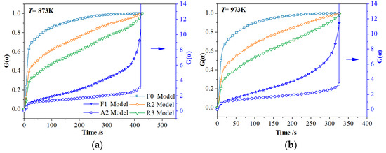 Based on the characteristics of bituminous coal combustion reaction, five mechanism function models (F0 Model, R2 Model, R3 Model, F1 Model, and A2 Model) of Table 3 are selected for kinetics analysis of bituminous coal combustion reaction in coupled combustion. In accordance with Equation (9), the rate constant of combustion reaction is derived from the correlation between the function models, G(a), and the reaction time, t (Figure 7). The shapes of the fitting curves differ significantly, and the F0 Model, R2 Model, and R3 Model all have a relatively wide linear range in the low-temperature zone; nevertheless, there is a linear partition in the high-temperature region, indicating that the F0 Model, R2 Model, and R3 Model may not be consistent with the actual reaction mechanism. For the F1 Model and the A2 Model, the shapes of the G(a) curves are similar. However, the F1 Model exhibits excellent linearity in the main reaction process and has a relatively wide linear range.