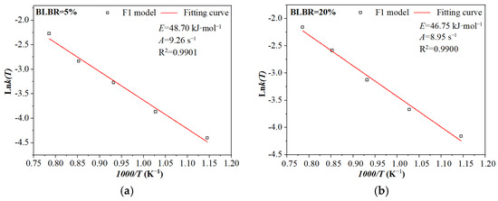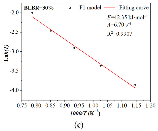 According to the concentration of CO and CO2 gas production during the coupling combustion, the linear relationship of the integral function of the mechanism model function F1 Model versus the reaction time, t, under different BLBR is studied. The bituminous coal combustion mechanism can be described by the F1 Model at different BLBRs; the kinetic parameters are shown in Figure 8. According to Figure 8, the apparent activation energy of the F1 Model was 48.70, 46.75, and 42.35 kJ·mol−1, and the pre-exponential factor was 9.26, 8.95, and 6.70 s−1 when the BLBR was 5, 20, and 30%, respectively. The bituminous coal combustion mechanism can be described by the F1 Model at different BLBRs, and the results of kinetic analysis are shown in Figure 8. According to Figure 8, when the BLBR is 5%, 20%, and 30%, respectively, the apparent activation energy is 48.70, 46.75, and 42.35 kJ·mol−1, and the pre-exponential factor is 9.26, 8.95, and 6.70 s−1. The results show that the apparent activation energy and the pre-exponential factor in coupled combustion changed slightly at different BLBRs. But, compared with bituminous coal combustion, the kinetic parameters of coupled combustion show a significant decrease [43]. Based on the above results, it can be found that the coupled combustion significantly increases the reaction rate of bituminous coal combustion.