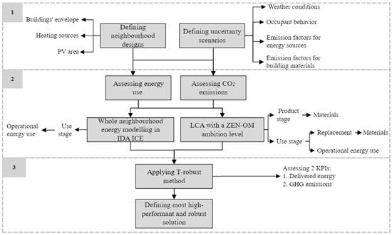 In the second step, the energy use of the whole neighborhood is assessed through detailed modeling for each design under each uncertainty scenario. Additionally, an LCA is conducted for all designs to assess GHG emissions, aiming for a specific ZEN ambition level. The latter involves assessing both embodied carbon in the building material (from raw material supply to manufacturing) and the use stage (materials’ replacement and energy use during operation).