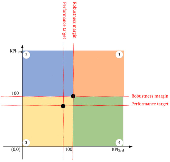In the third step, the T-robust method developed in [3] is applied to assess two KPIs and calculate the MT-KPI, which integrates performance targets across multiple criteria into the decision-making process, thus eliminating the need for criteria weighting. The MT-KPI is defined based on the number of KPIs considered; for instance, Homaei and Hamdy [3] utilized two KPIs, while Moschetti et al. [4] expanded it to three. The MT-KPI penalizes infeasible solutions by incorporating a robustness margin for each KPI. Each KPI has a corresponding performance target and robustness margin that creates different performance zones, as illustrated in Figure 2. The calculation of the MT-KPI depends on these performance zones and is defined in Table 1 for the two KPIs considered in this study, KPI1 and KPI2. Here, KPIi,rel represents the relative performance of each indicator, based on the robustness margins (KPIi,m), and is calculated as shown in Equation (1).