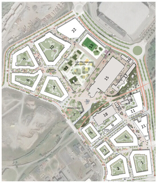 Site plan of Flytårnet neighborhood, from [5]. Buildings marked in gray (15-16-17-18-19) are existing buildings planned for renovation, while those in white will be newly constructed.