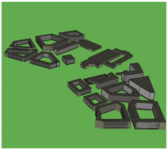 A comprehensive model of the neighborhood under study, encompassing all identified designs and scenarios, was developed (Figure 4) using the dynamic simulation software “Indoor Climate and Energy software” (IDA ICE) version 4.8. This software has undergone validation in numerous studies adhering to CEN standards and ASHRAE standards [45,46]. Modeling the neighborhood with IDA ICE enabled the analysis of energy consumption and generation on an hourly basis, which is important for understanding the real-time dynamics of energy use. This level of detail allows for precise evaluation of self-produced electricity consumption patterns within the neighborhood, as well as potential exports to the grid. Moreover, this model is flexible, allowing the consideration of various simulation factors, such as different climates and specific parameters related to occupant behavior.