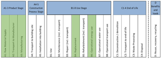 This study adopted the “ZEN-OM” ambition level, covering the production stage (A1–A3), replacements (B4), and operational energy use (B6) throughout the life cycle of the neighborhood. The stages mentioned are illustrated in Figure 5. ZEN-OM is among the ambition levels proposed by Laulesset et al. [47] for achieving carbon neutrality in a zero-emission neighborhood. These levels stem from the recommendations outlined by the FME ZEB known as the “Zero-emission Buildings (ZEB) definition” [48]. The framework involves integrating various life cycle modules, spanning from A1 to C4. The selection of specific modules depends on the ambition level set by the project owner.