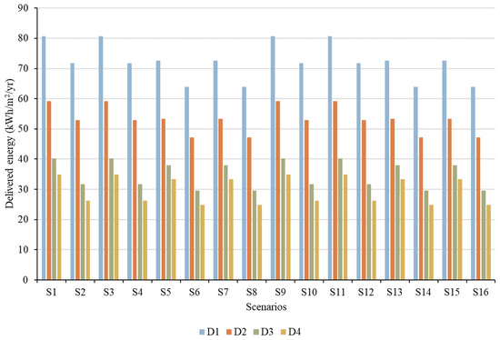 The hourly energy generation from PV was determined through IDA ICE software based on the allocated PV area varying among the designs being considered for the neighborhood (see Table 3). The estimation of generated energy depended on factors such as varying yearly weather conditions and system efficiency (set to 18%), along with the available roof area. The orientation of the PV panels was set to face south, with an inclination of 30°, which was determined to be the most effective combination for energy generation.