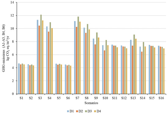 Sixteen alternative scenarios were identified to assess the effect of different uncertainties, including changes in climate conditions, CO2 emission factors for materials and energy systems, and occupant behavior.