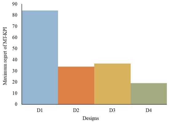 Following the MT-KPI calculations, the minimax regret method [20] was used to evaluate the difference between each design’s MT-KPI value in each scenario and the minimum performance across all designs for that scenario. This difference is termed performance regret, as defined by the minimax regret method. The maximum performance regret indicates the greatest deviation for each design, representing the largest gap between its worst and best performance. Consequently, the most robust design is identified as the one with the smallest maximum performance regret across all scenarios. Further details on the T-robust method are given in Table A3 and Table A4 in Appendix A.