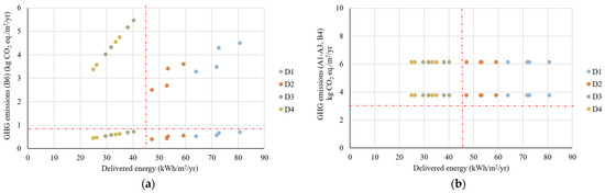 The second KPI focuses on GHG emissions associated with the production stage (A1–A3) and two modules in the use stage: replacement (B4), as well as operational energy use, including on-site energy (B6). The target value is derived from the sum of target values in each of the life cycle stages considered. For GHG emissions related to building material production and replacement (A1–A3 and B4), the target value is calculated by multiplying the low identified emission factor for each building category as given in [28] by the respective building areas and then summing them up. Additionally, for PV panels, the target value is defined by multiplying the maximum available area for installing PVs on the roofs of the buildings in the neighborhood by the lowest emission factor among the two values considered in our calculations, specifically that related to environmentally friendly materials. For the GHG emissions associated with a building’s delivered energy (B6), the target value is defined by multiplying the first KPI target by the lowest emission factor for electricity as the most used source of energy in Norway. It was assumed that the robustness margin allows a 5% tolerance from the performance target. Table 6 illustrates the target values and correspondent robustness margins for each of the KPIs analyzed in this study.