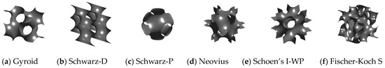 29]. Due to their high heat transfer coefficients and simultaneously high specific surfaces, such structures are suitable geometric configurations in latent TES systems. An overview of well-known TPMS geometries is summarized in