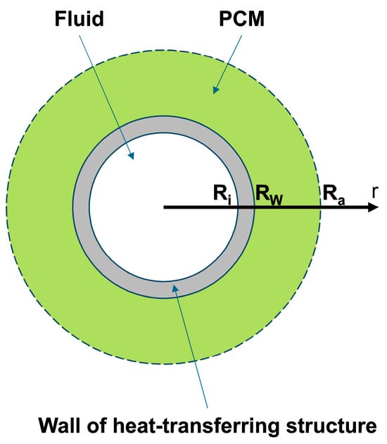 r) and transient substitute model includes the PCM only as a capacity term. In principle, this assumption underestimates the total available storage capacity, but the capacitive proportion of the non-considered sensible wall is, compared to the PCM, negligible or very low, both in relation to mass and specific storage capacity. This well-founded simplification results in an enthalpy-based radial formulation according to Equation (13):