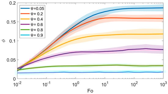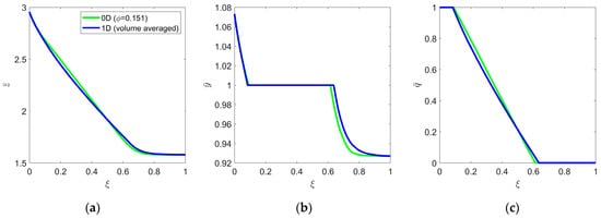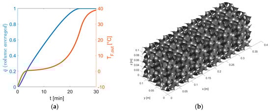 The temporal characteristics of the dimensionless enthalpy (), temperature () and liquid–solid fraction () show very good agreement between the detailed substitute and the 0D-based model. After approx. 10% of the time, the melting temperature at = 1 is reached and the solidification process begins. At the end of the phase change at = 0, there is a further sensible temperature drop down to the cooling temperature.