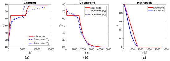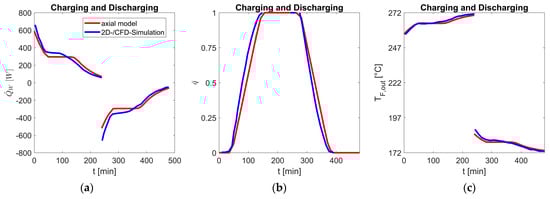 32], were used to verify and validate the dimensionless axial model according to Equations (9) and (10). The results for the finned tube with salt as the PCM and thermal oil (Syltherm-800) as the heat transfer medium are based on a detailed 2D model, which was additionally verified using CFD simulations. For the plate geometry, experimental results with a wax (RT64HC paraffin) as the PCM and water as the heat transfer medium were used, whereby separate analyses were conducted for charging and discharging.