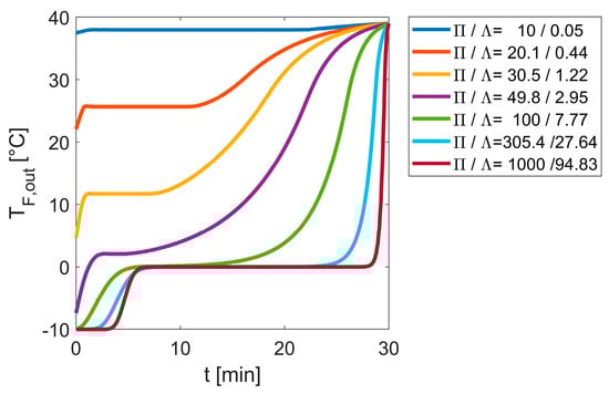 The transient characteristics show that the specified outlet temperature of 39 °C is reached at the end of the discharge period for the iteratively determined solutions. With increasing dimensionless parameters, lower (temporally averaged) outlet temperatures result, thus resulting in higher efficiencies. The reason for this behavior is associated with the heat-transferring structures—expressed in a dimensionless way through parameters and —achieving high heat transfer between the storage and fluid medium through high specific surfaces and effective transfer coefficients.