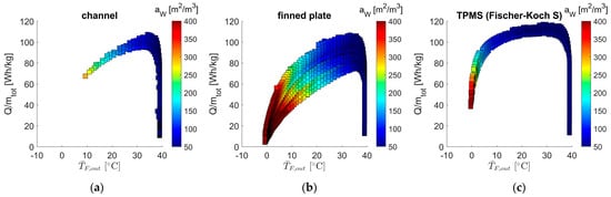 In comparison, the advantages of TPMS-based structures in terms of gravimetric and volumetric storage density with only moderately high required specific surfaces are obvious. Here, only in relation to the PCM—without wall structures, internal fluid paths and the enclosure—can approx. 69% of the maximum possible storage density be utilized, whereby additional capacitive terms—the TPMS structure itself—were not considered. Alternative solutions are offered by finned plates with commercially available specific surfaces. Tube geometries, however, achieve comparable dimensions, but with untypical high specific surfaces and, thus, very small hydraulic diameters of 5 mm. The technical feasibility can therefore be seen as critical due to the large number of required pipes.