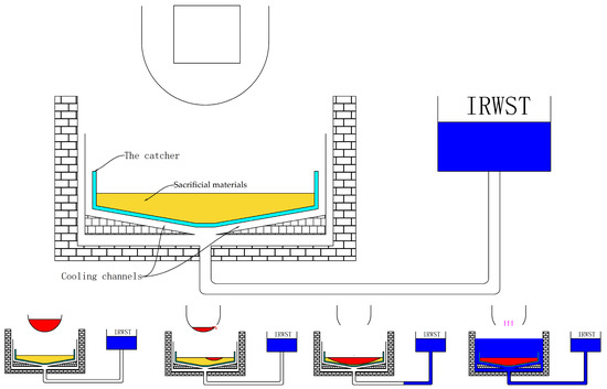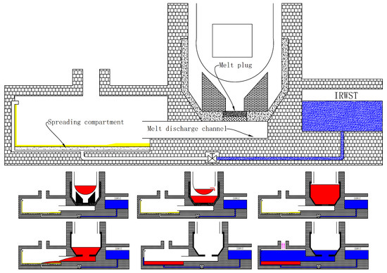 The EPR was designed and developed by Framatome (now Areva NP) and Électricité de France (EDF) in France and Siemens in Germany. The EVR design of EPR is reported by Fischer [8]. As shown in Figure 2, this core catcher mainly consists of three parts, namely as a specially designed reactor cavity with a melt plug, a melt discharge channel and a spreading compartment. After the failure of RPV, the corium is temporarily collected in the reactor cavity for a couple of hours at first to eliminate the effects on melt composition in different accident scenarios. Then, the corium is transferred through a short melt discharge channel to a large room, i.e., the spreading compartment. Finally, after spreading on the ground, the corium is cooled by underground channel-cooling system and water flooding. Fischer et al. [18] prove that the channel-cooling system has an excellent performance of heat transfer, which can deal with a heat flux of more than 120 kW/m2, by a 1:1 scaled test channel. Bouteille et al. [19] summarize the results of the Level 2 PSA and give the main results of the evaluation of the radiological consequences of core melt on the environment as 9 × 10−8 per year.