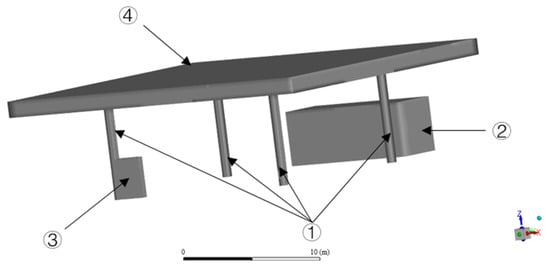 Hydrogen refueling station geometry: (1) cylindrical pillars, (2) HRS building, (3) hydrogen dispenser, and (4) canopy.