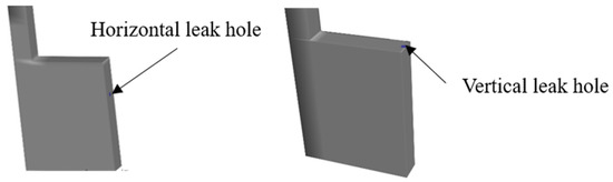 The leak holes are square in shape and have two different sizes: 5 mm × 5 mm and 10 mm × 10 mm. In case of vertical leakage, both sizes of the leak hole are considered, whereas for horizontal leakage, only the 10 mm × 10 mm size is used. The specific positions of the leak holes are shown in Figure 3. The storage pressure is set at 35 MPa, which is the same as the hydrogen refueling pressure for vehicles. The high-pressure hydrogen release can be considered as an under-expanded jet [25]. Under-expanded jets include typical shock structures, including expansion fans, barrel shock, Mach disk, and reflected shock, which occur near the hole. Simulating these shock structures directly requires setting up fine grids and using small time steps near the leak hole. This would significantly increase computational cost and simulation instability. Therefore, the Birch 1984 notional nozzle model [26] is adopted to calculate the velocity at the leak hole as 2187 m/s. The SIMPLE algorithm is employed to solve the flow field in this study. Except for the transient term, which uses a first-order implicit scheme, the other terms are discretized by using a second-order upwind scheme. The simulation time step is set to 0.01 s and the total time is 30 s, during which hydrogen is released continuously. The effect of wind speed is not considered in this study. Further details can be found in Table 2.