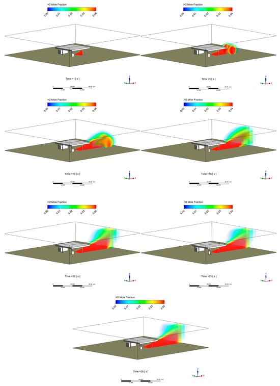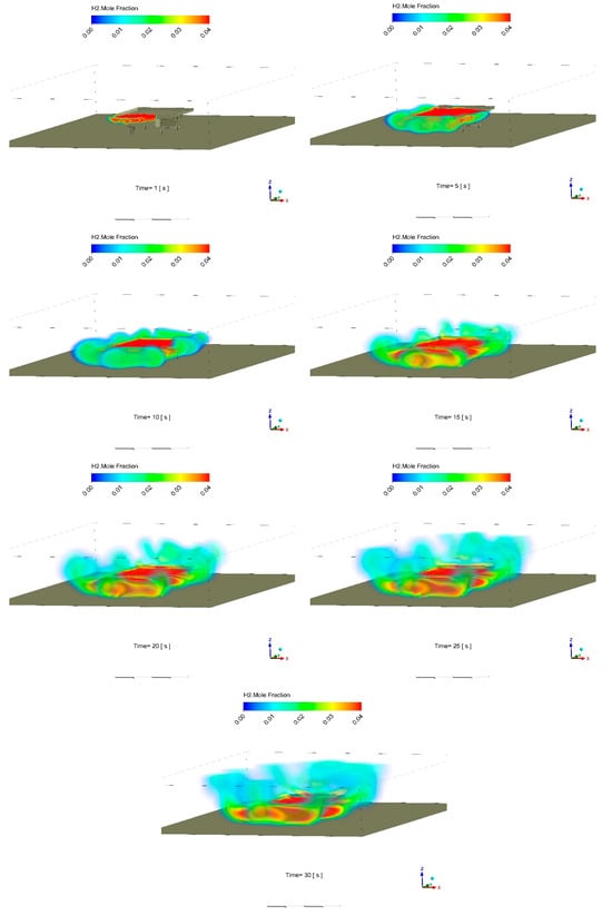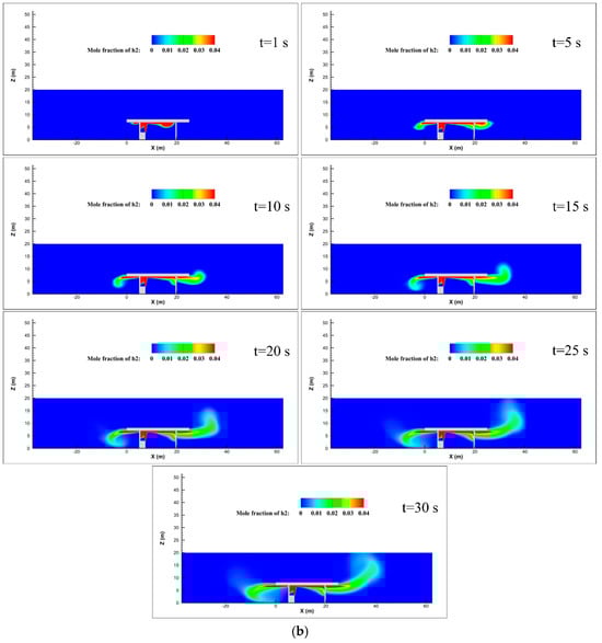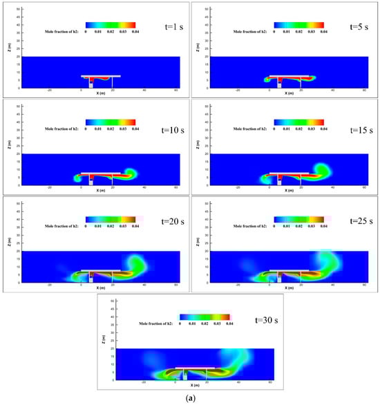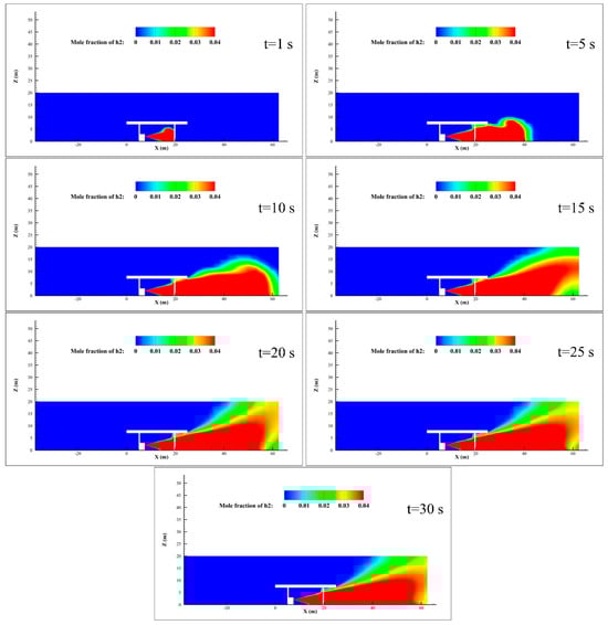 Firstly, we investigate the diffusion characteristics of horizontally released hydrogen in S1. Figure 4 presents the concentration distribution of hydrogen for different leakage times. The upper limit of the hydrogen mole fraction was set at 4%, which is the lower flammability limit of hydrogen in air. At the initial stage, the profile in the near-field exhibits momentum-dominated behavior because of the high momentum of hydrogen. Subsequently, within the shear layer of the jet, the high-speed hydrogen transfers momentum to the stagnant air, causing the surrounding air to be continuously entrained into the jet. As a result, the profile of the flammable gas cloud expands, and the jet velocity decreases. At 10 s, after the jet velocity decreases to a critical value, the flow is dominated by buoyancy and the diffusion path begins to move upward. At 15~30 s, there is little change in the profile of flammable gas cloud. During the leakage period, as hydrogen continuously mixes with air, the flammable gas cloud gradually becomes diluted and eventually confined to the central region of the jet. In the region dominated by buoyancy, the concentration of hydrogen is below the lower flammability limit.