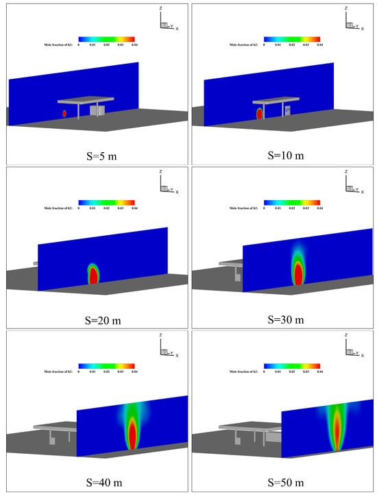 Figure 5 illustrates the hydrogen mole fraction at cross-sections (y-z plane), with different axial distances from the leakage hole at 30 s. The red region indicates areas where the hydrogen mole fraction exceeds 4%. It can be observed that the profile of the flammable gas cloud is circular before being obstructed by the ground. Due to the mixing of hydrogen with air, the profile of the flammable gas cloud gradually expands. When the profile is exposed to the ground, the diffusion of hydrogen near the ground is impeded, causing the cloud to expand laterally with the cross-sectional shape like that of a candle flame. Although the presence of the canopy also hinders the radial expansion of the profile, the leakage hole is closer to the ground compared to the distance to the canopy, resulting in minimal influence of the canopy on the radial diffusion, except for diffusion at the edges of the canopy. As hydrogen continues to mix with air, the flammable gas cloud expands vertically. This is because the buoyancy effect enhances the diffusion upward into the air. Finally, The concentration of hydrogen decreases as it moves away from the leakage point and the size of the flammable gas cloud profile decreases.