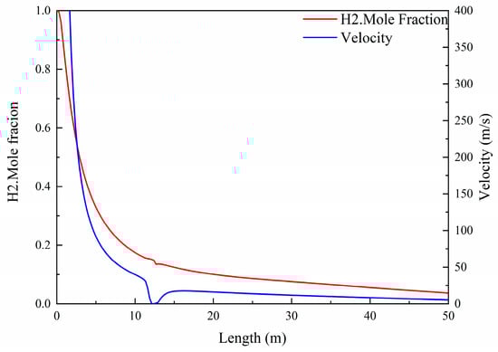 The mole fraction of hydrogen and velocity along the jet centerline.