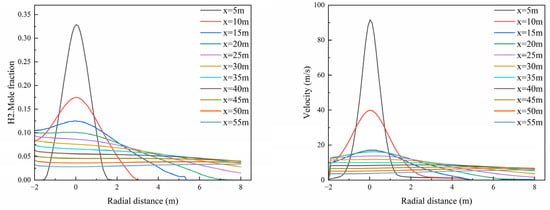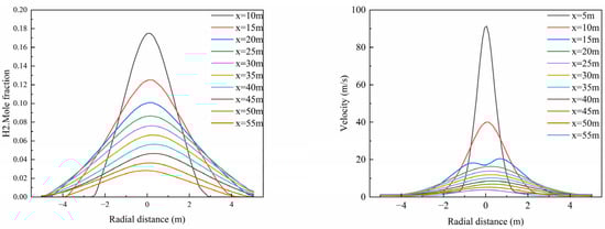 Figure 8 shows the distribution of the hydrogen mole fraction and velocity in the radial direction at 30 s. The fluctuation in velocity at x = 15 m is caused by the obstruction of a pillar in the jet path. The hydrogen concentration and velocity are at their maximum at the axis of the jet, and gradually decrease along the radial direction. The concentration and velocity of hydrogen increase as the distance decreases. However, the affected region becomes smaller simultaneously.