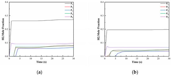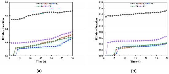 The variation in hydrogen mole fraction over time: (a) 10 × 10 mm, (b) 5 × 5 mm.