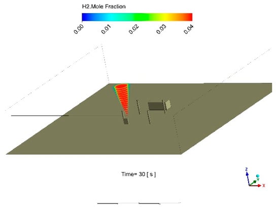 Due to the high velocity of flow, the jet quickly exits the computational domain and reaches a steady state at the initial stage. Therefore, Figure 13 only shows the profile of hydrogen concentration at 30 s for a 10 mm × 10 mm square leakage hole. It is evident that when there are no obstructions along the diffusion path, the flammable gas cloud takes on a conical shape, with its apex positioned at the leakage hole.