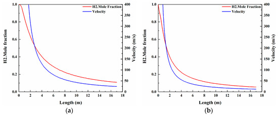 Mole fraction of hydrogen and velocity along jet centerline: (a) 10 × 10 mm, (b) 5 × 5 mm.
