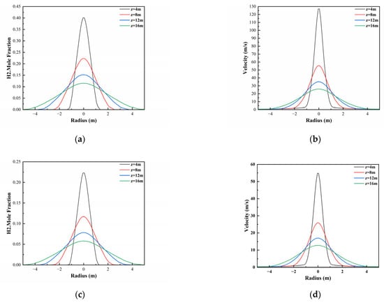 Mole fraction of hydrogen and velocity along radial direction of jet: (a) mole fraction of hydrogen (10 × 10 mm), (b) jet velocity (10 × 10 mm), (c) mole fraction of hydrogen (5 × 5 mm), (d) jet velocity (5 × 5 mm).