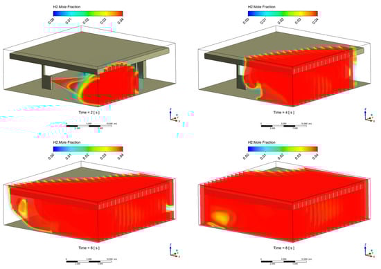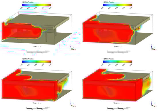 Figure 18 shows the profile of the flammable gas cloud for a vertical hydrogen leakage. The size of the leakage hole is 10 × 10 mm. It can be observed that during the initial stage of leakage, hydrogen diffuses vertically and encounters the canopy. As a result, the flammable gas cloud primarily accumulates near the lower surface of the canopy. Subsequently, the hydrogen jet is then confined by the wall, causing the flammable gas cloud to expand horizontally. At 8 s, the profile expands to the entire station due to poor ventilation, except for a partial area above the canopy.
